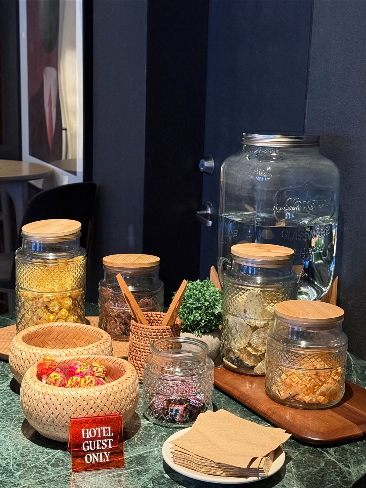 台北大安伊普索酒店五樓轉角有開放式 mini bar 區,擺放著迎賓小點餅乾、糖果,搭配辦理入住時服務人員送上的熱茶,還沒入住就有度假般感受。