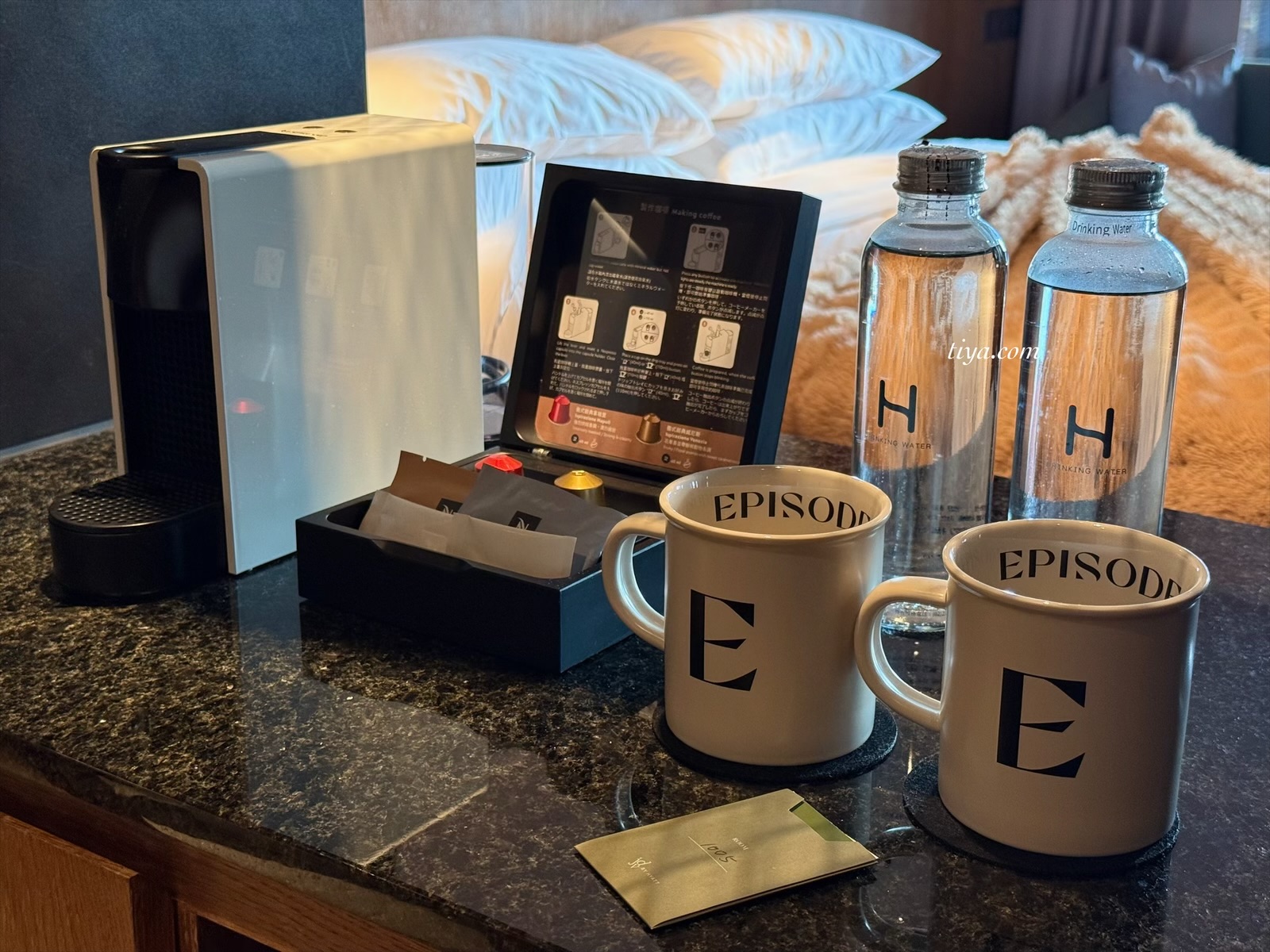 台北大安伊普索酒店豪華客房內備品 ,除了基本的 Nespresso 電熱咖啡壺、水壺,還有 Nespresso 膠囊咖啡與茶包。