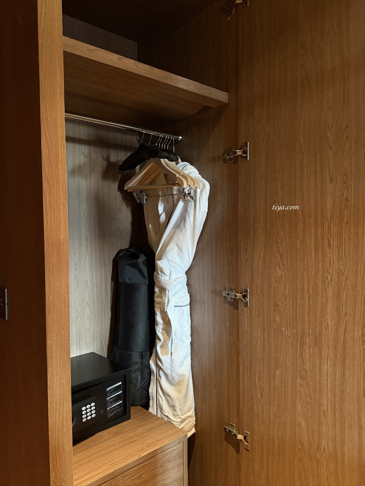櫃內提供睡袍、拖鞋、瑜伽墊和保險箱等設備。