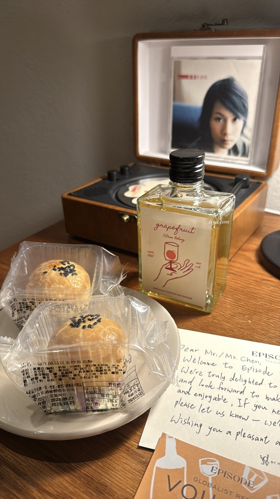 因應中秋節期間入住,台北大安伊普索酒店加贈兩顆自家出品的益生菌屋豆金莎蛋黃酥,外層酥香、內餡融合豆香與蛋黃,搭配調酒一同享用,很有節慶氣氛。
